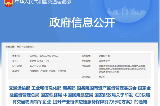 交通部等八部门印发《加快培育交通物流领军企业提升产业链供应链服务保障能力行动方案》